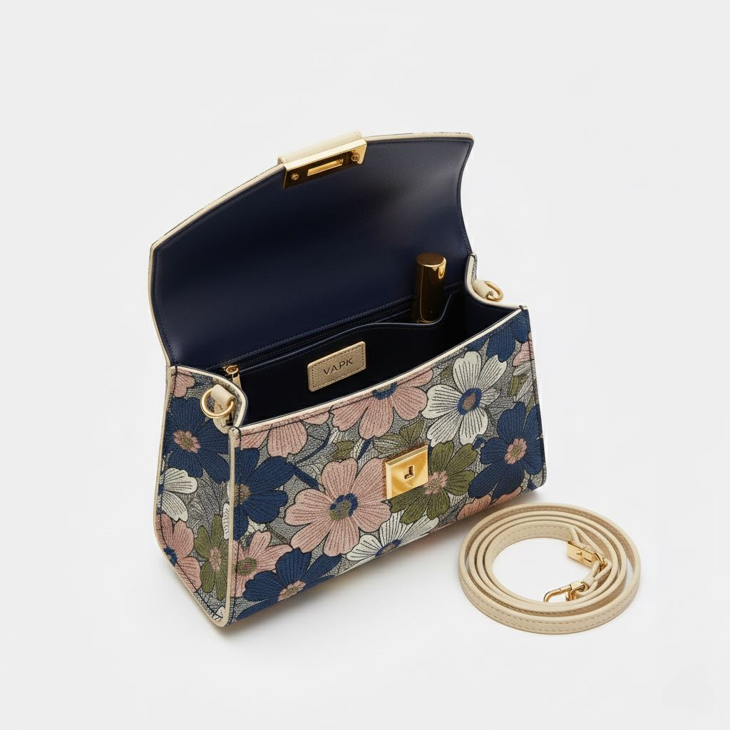 Step into a garden of style with the VAPK Floral Mini Handbag. This exquisite piece is designed for those moments when you want to carry just the essentials with a statement-making flourish. Crafted with a premium textured fabric featuring a unique and vibrant floral pattern, this handbag is a wearable work of art. Its structured, compact silhouette, along with the VAPK-branded clasp, offers a blend of playful charm and high-end sophistication. Perfect for a special occasion or to elevate your everyday look, this is more than just a bag—it’s a blooming accessory