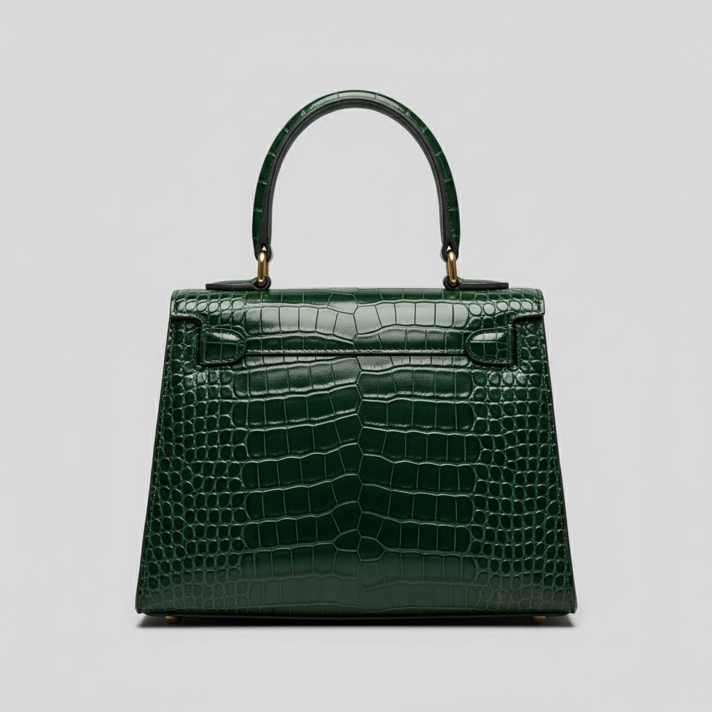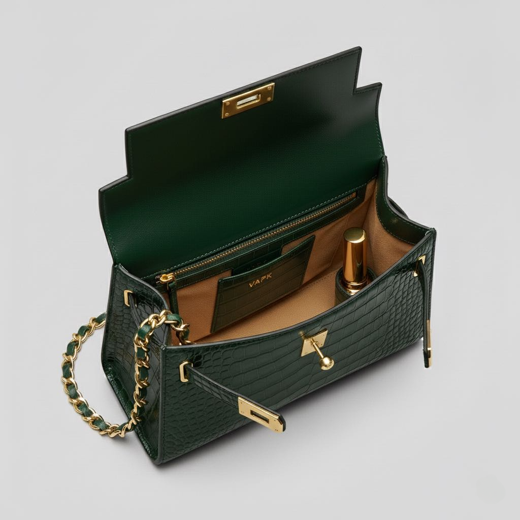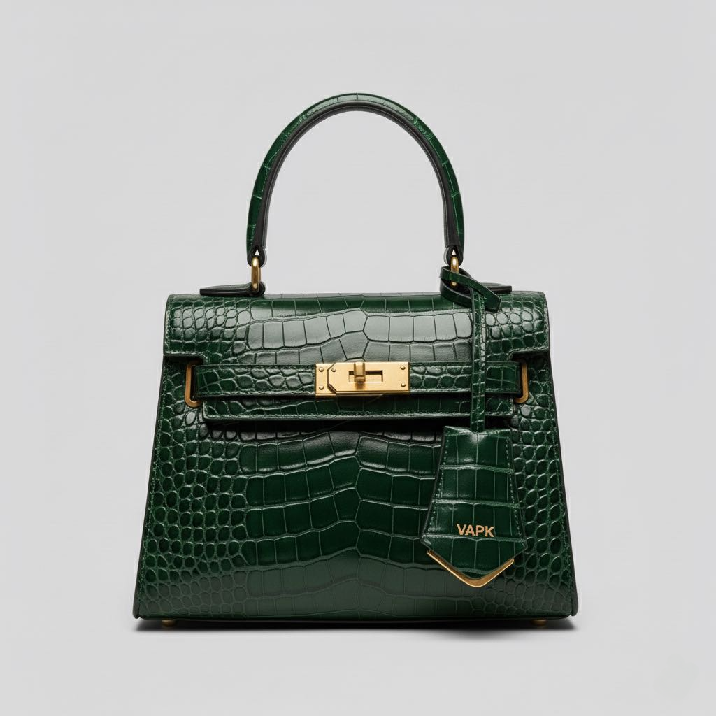 The VAPK Kelly Bag is a statement piece, blending timeless elegance with modern luxury in a rich emerald crocodile-embossed finish.